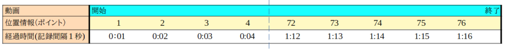 では『旅ログviewer sio-musubi』はどのようにして動画と位置情報を結び付けているかというと、位置情報の記録間隔を利用しています。GPS信号を受信できていれば(そして全て記録していれば)記録間隔はほぼ一定です。動画の再生時間を位置情報のポイント数で割り返し、各ポイントの通番に記録間隔を掛け合わせれば動画の再生位置に合わせることができます。